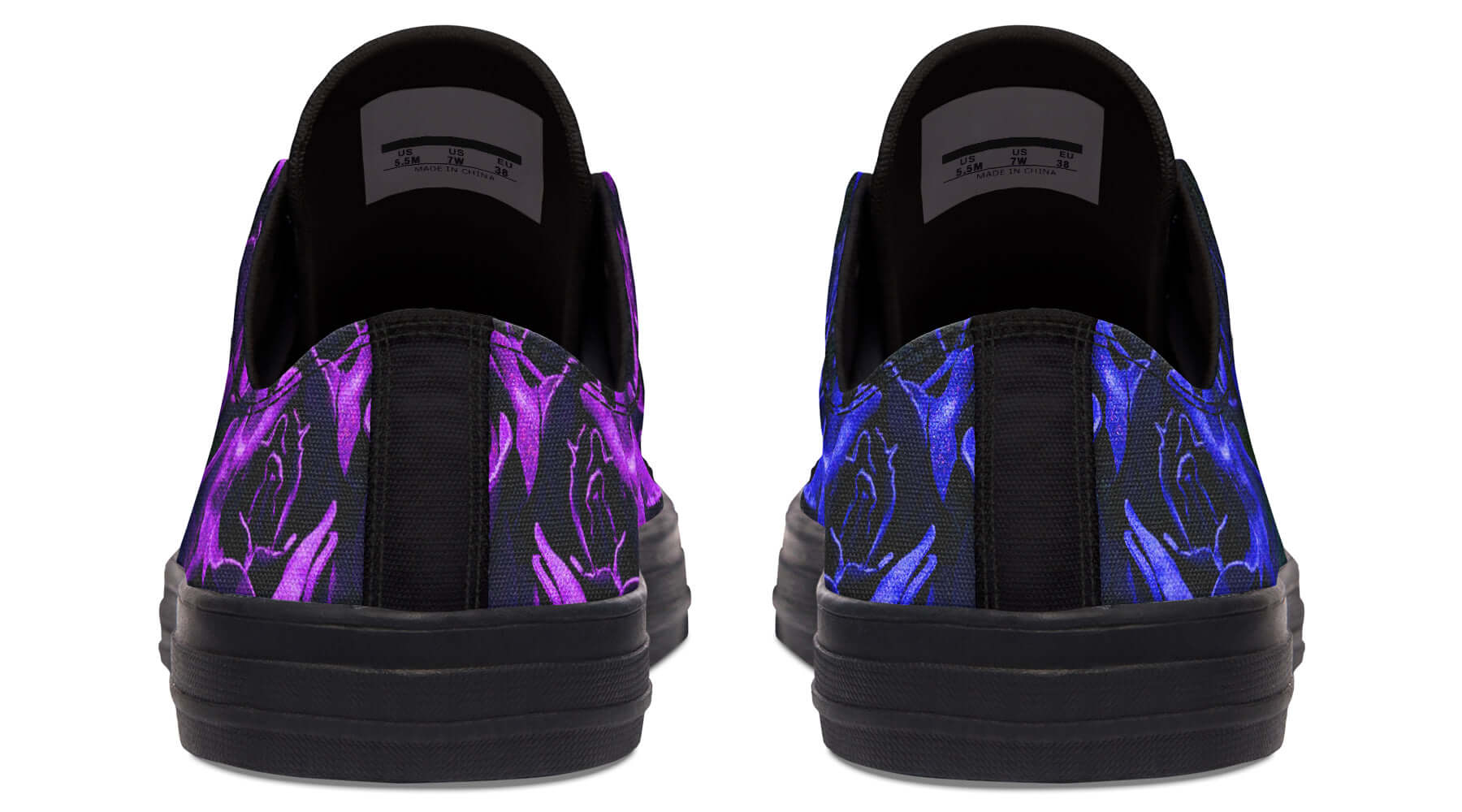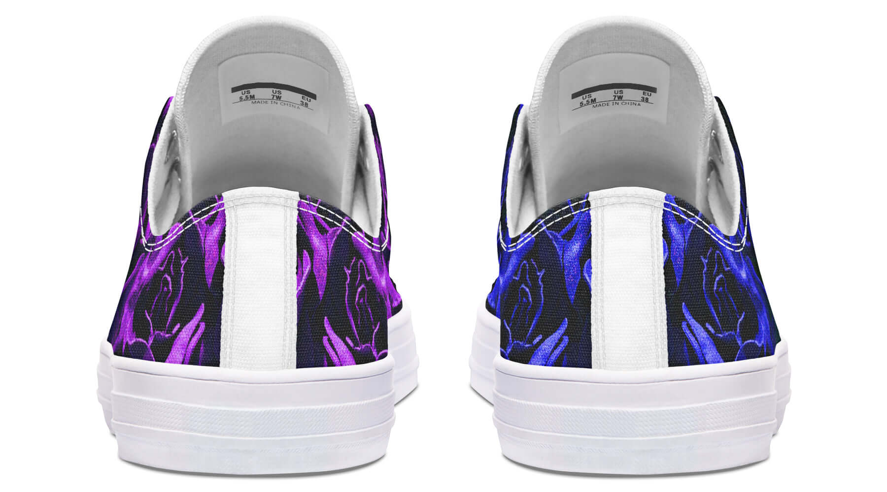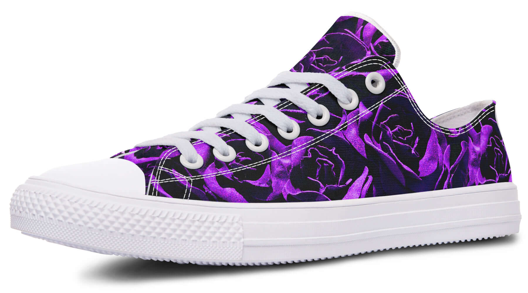 Dark romance blooms with the Purple & Indigo Rose Low Tops by ANTIBrand. These canvas trainers combine gothic aesthetics with everyday edge, featuring a bold split rose print – one shoe in indigo, the other in purple.
