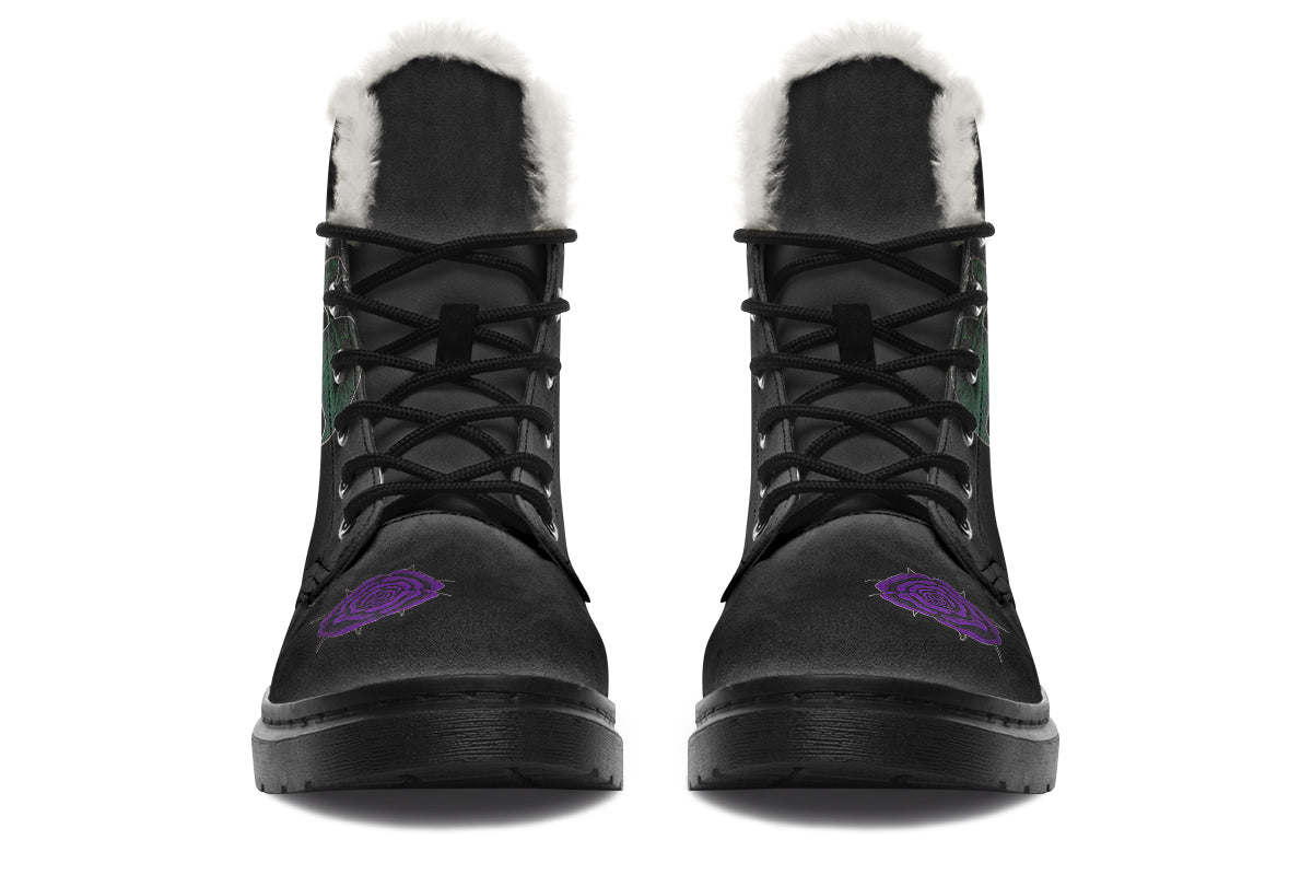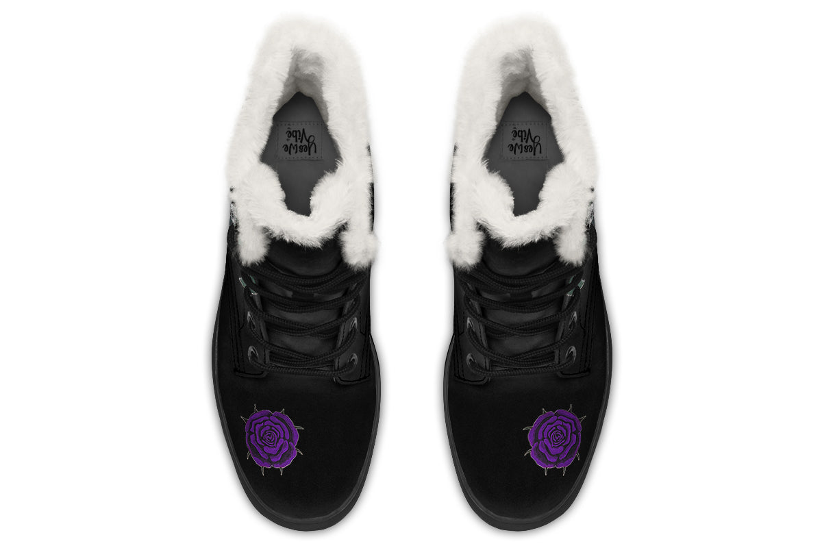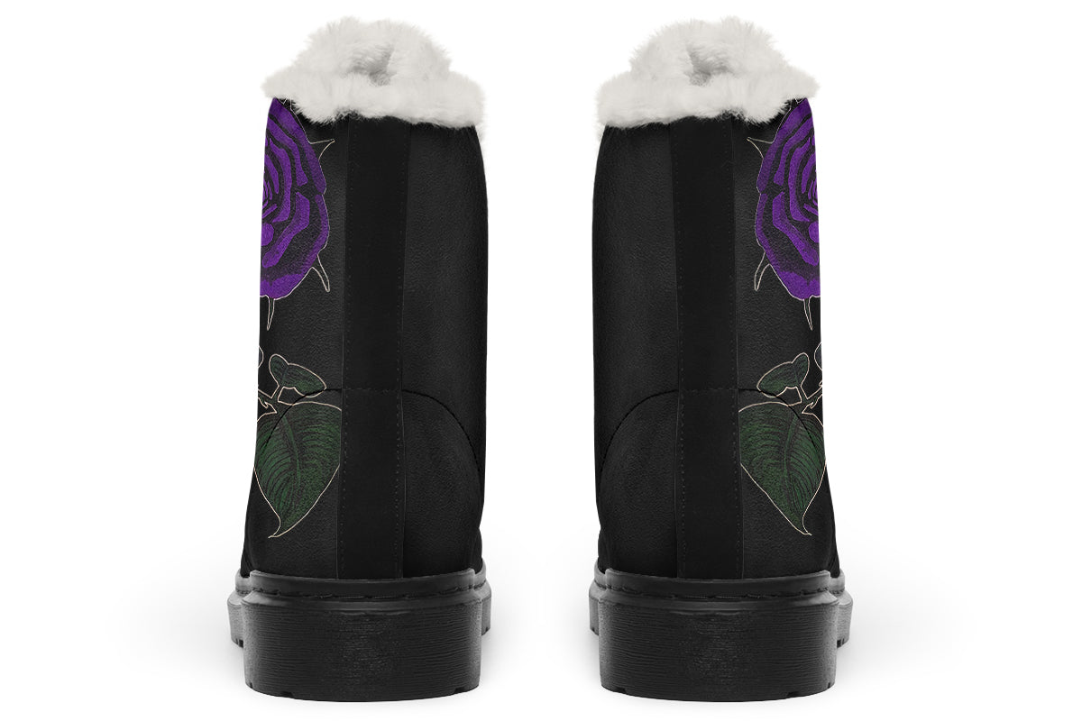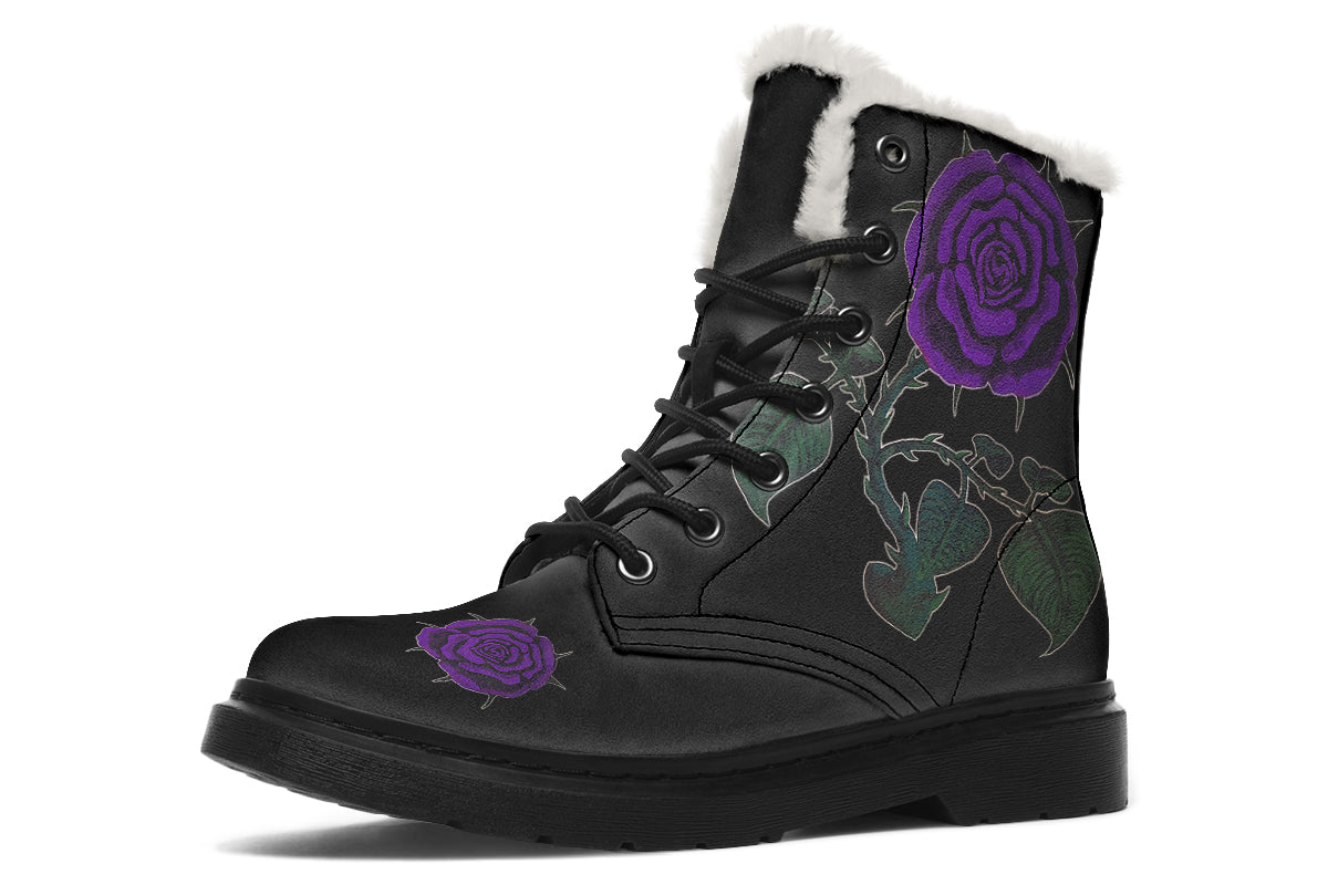 Step into gothic elegance with the ANTIBrand Rose Painting Purple Fleece Lined Boots. Featuring beautifully illustrated purple roses against a black background, these boots add an artistic edge to any alternative look. The fleece lining ensures warmth and comfort, while the detailed rose motif makes them stand out as wearable art.