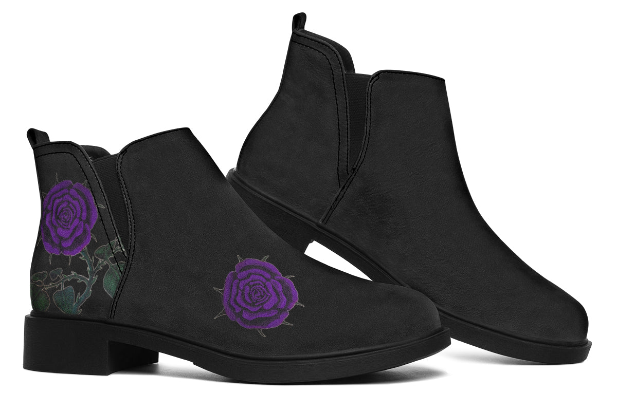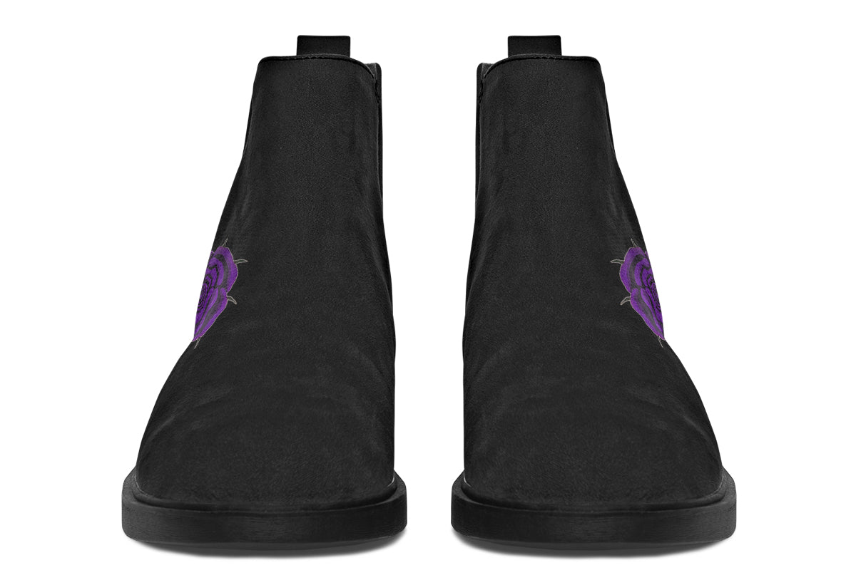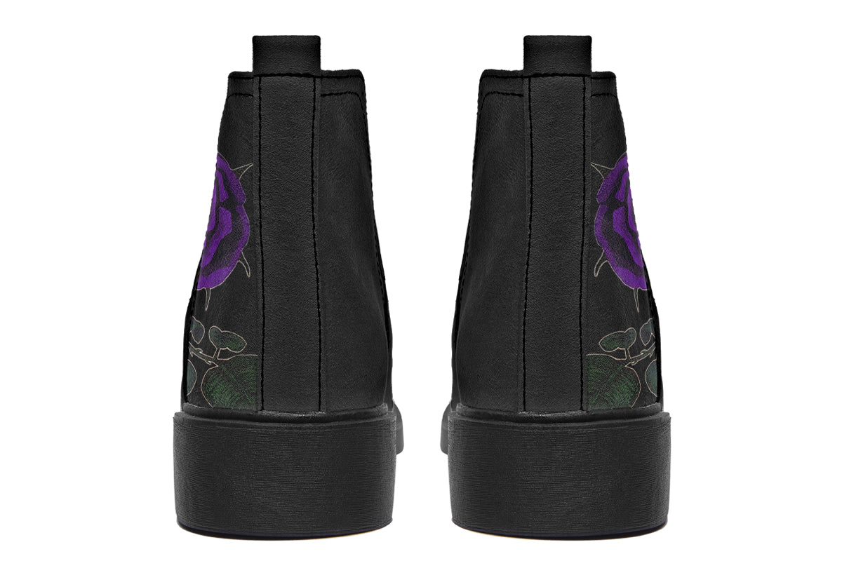 Walk in romantic darkness with the ANTIBRAND Rose Painting Purple Chelsea Boots. Featuring bold purple rose graphics on a sleek black base, these boots balance elegance with alternative flair. The intricate floral design makes them a statement piece for goth and romantic aesthetics alike.