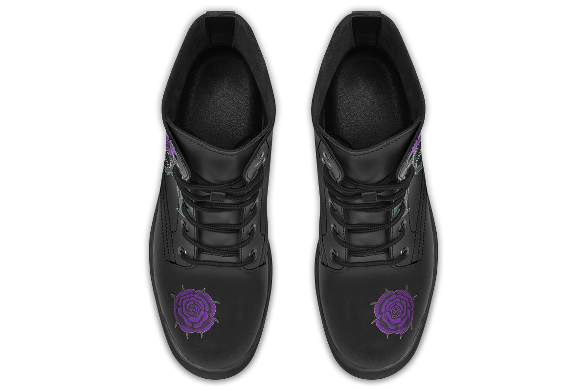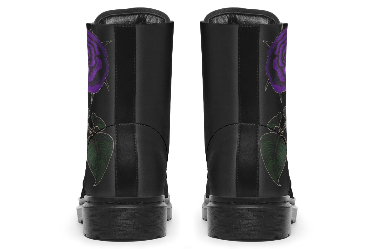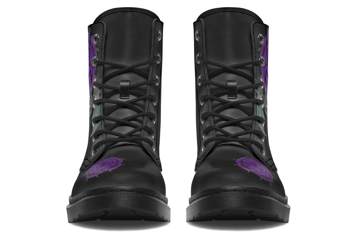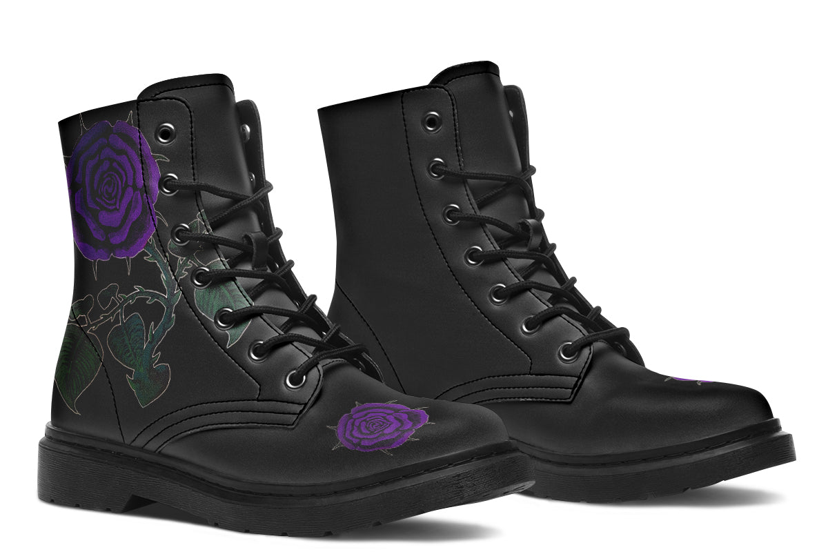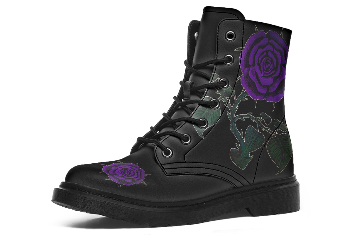 Dark romance comes to life in The Painted Rose Boots in Purple by ANTIBrand. Featuring a bold, illustrated thorned rose creeping up a matte black vegan leather upper, these combat boots are a gothic dream made wearable.